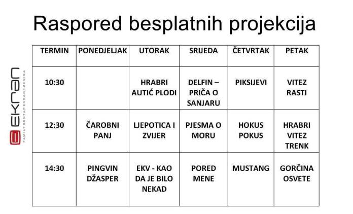 Pošto naš objekat ima sopstveno grijanje, odlučili smo organizovati BESPLATNE PROJEKCIJE u Multiplexu Ekran Zenica, te ponuditi našim građanima da se ugriju u toploj kino sali 3. Od Ponedjeljka do Petka, u terminima od 10:30, 12:30 i 14:30h, imate priliku uživati u reviji fantastičnih naslova. Dobro nam došli”, stoji u saoćenju.