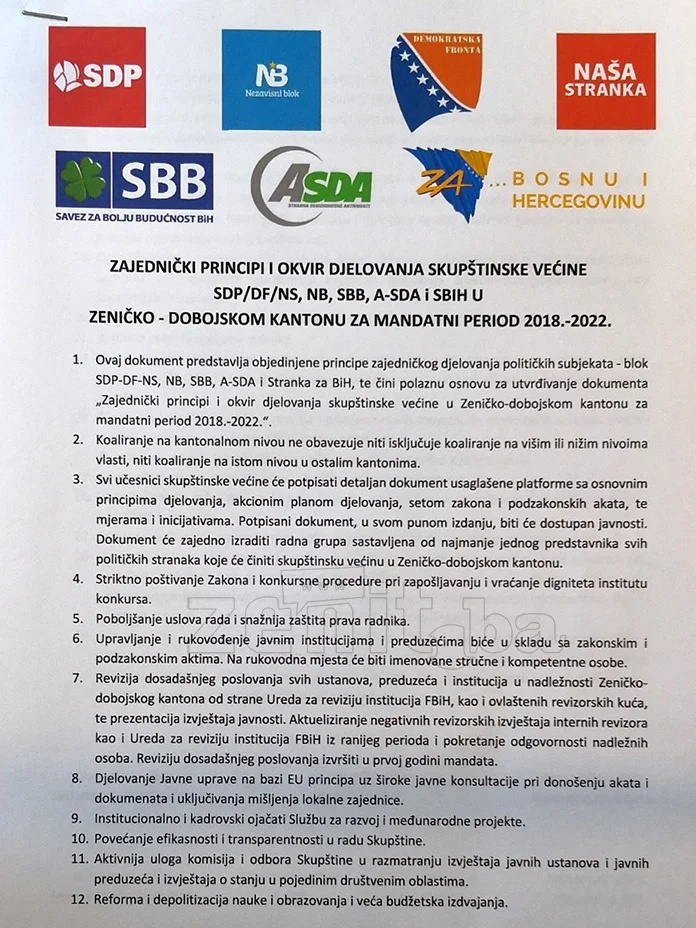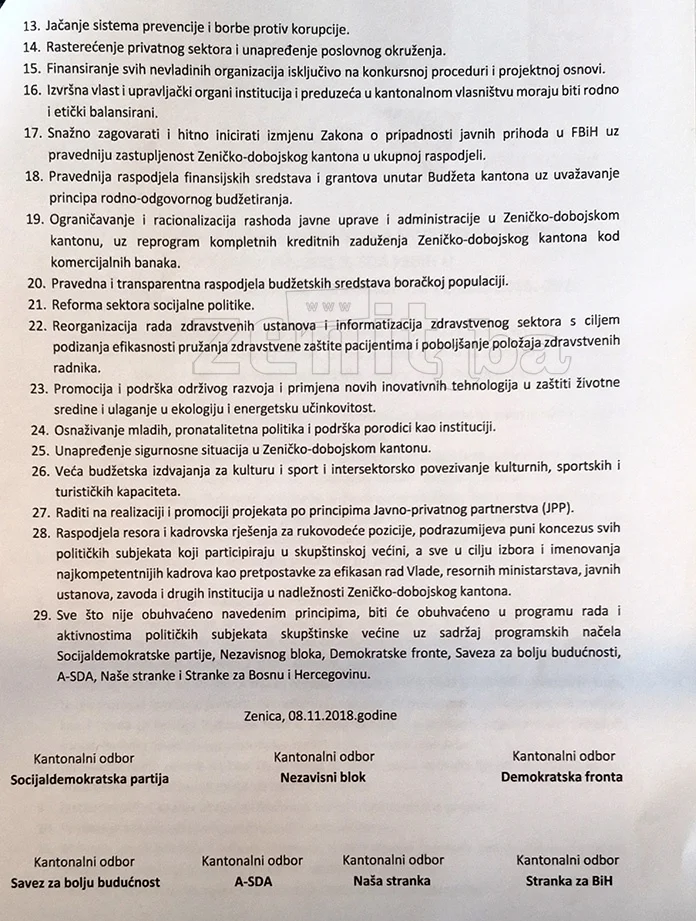 U prostorijama SDP Zenica održana je zajednička konferencija za novinare na kojoj je potpisan sporazum između SDP-a, DF-a (Nezavisni blok sa partnerima Snaga centra, Hrvatska stranka prava i Prva stranka), SBB, A-SDA i Naša stranka.