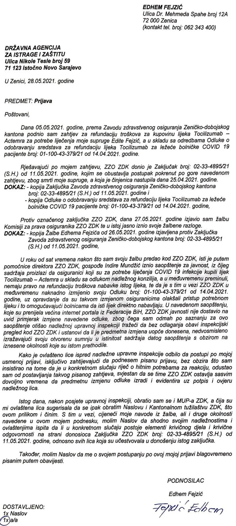Upravo zbog nemogućnosti da ostvari pravo na refundaciju troškova za nabavku lijeka, Edhem Fejzić je ovaj slučaj prijavio Državnoj agenciji za istragu i zaštitu i Kantonalnom tužilaštvu ZDK.