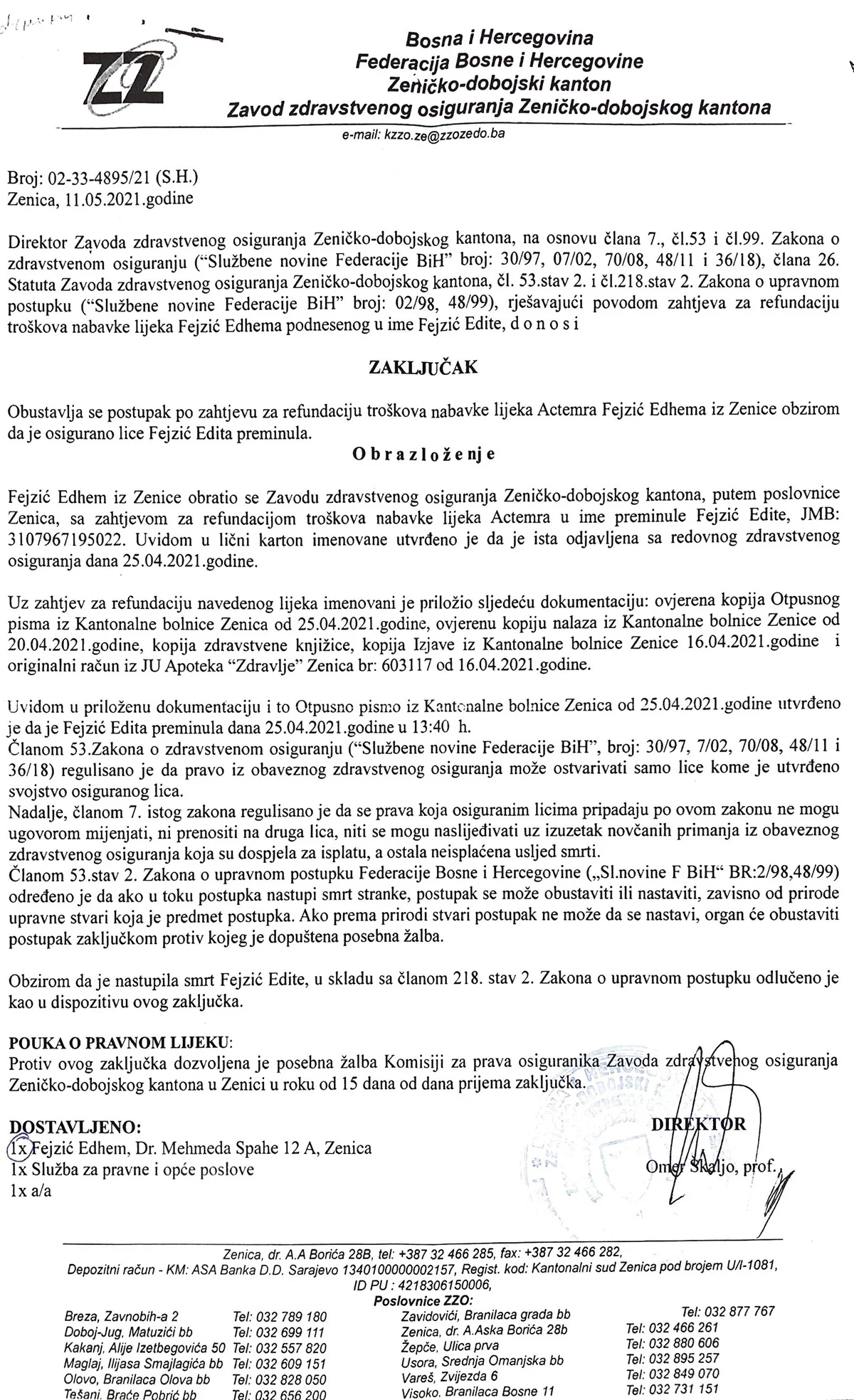 U međuvremenu, preminula je njegova supruga Edita zbog čega je Zavod zdravstvenog osiguranja ZDK obustavio postupak.