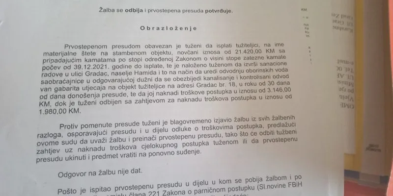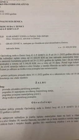Nakon vještačenja Sud je u više navrata presudio u korist Zeničanke, ali Grad Zenica je odbio da plati štetu, a odbio je i da naloži radove kako u budućnosti ne bi došlo do sličnog scenarija. Odšteta je procijenjena na 21.420 KM sa pripadajućim kamatama počev od 29.12.2021. godine.