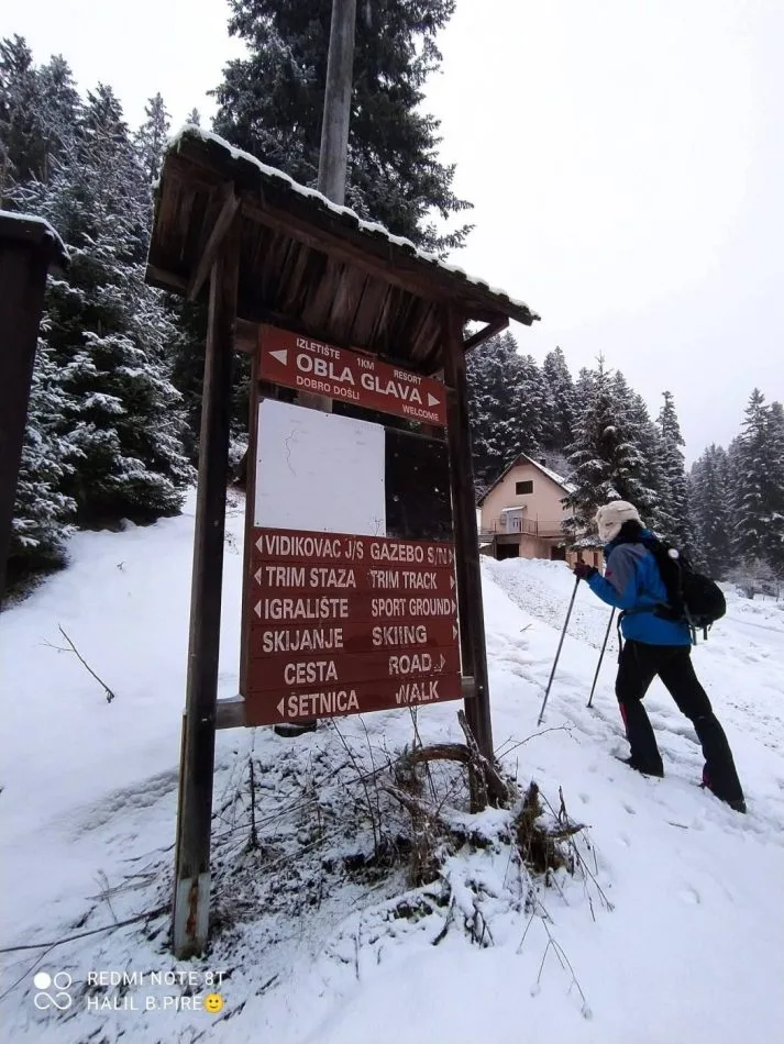 Zbog snijega i guste magle, planinari su promijenili prvobitnu rutu te su, umjesto kraćeg puta, nastavili preko Zaruđa prateći žute markacije “Puta zdrave hrane”. Na taj način stigli su do izletišta i restorana Wigvam, poznatog po brojnim sadržajima za odmor i rekreaciju. Od Wigvama su nastavili uređenom trim-stazom do vrha Obla glava, gdje je napravljena pauza za odmor, osvježenje i doručak.